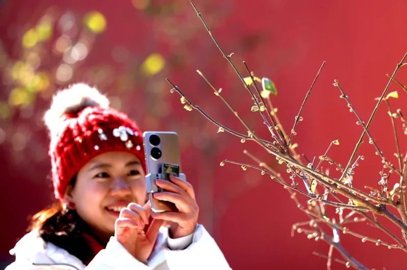 北京自12月11日起至今天,持續攝氏零度以下的低溫累計超過300個小時,創下繼1951年有完整紀錄以來,12月期間北京最長連續低溫。圖為北京國家植物園園區的臥佛寺內,早花蠟梅相繼綻放,引來遊人拍照。圖/中新社