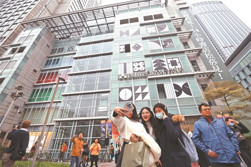 台北信義誠品昨晚正式熄燈,許多民眾在店外拍照留念。圖/中央社