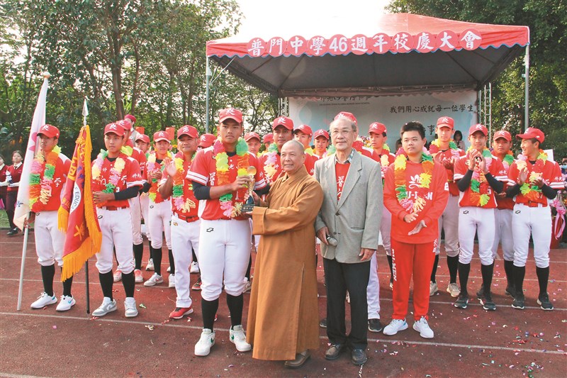 普門中學棒球隊把硬式鋁棒組冠軍獎杯獻給學校,由慧傳法師(前排中)代表接受。圖/人間社記者李生鳳