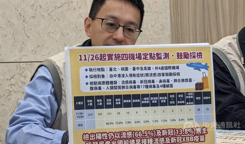 疾管署自11月26日起針對中港澳入境有症狀旅客「定點監測、鼓勵採檢」措施,截至12月24日已採檢213人,其中167人為陽性,檢出陽性仍以流感66.5%、COVID-19冠狀病毒者有13.8%,顯示中國大陸疫情應該還是以流感和COVID-19為主。羅一鈞呼籲民眾出國前接種流感及COVID-19最新XBB疫苗,務必落實落實勤洗手、有發燒、咳嗽等症狀戴口罩等措施。