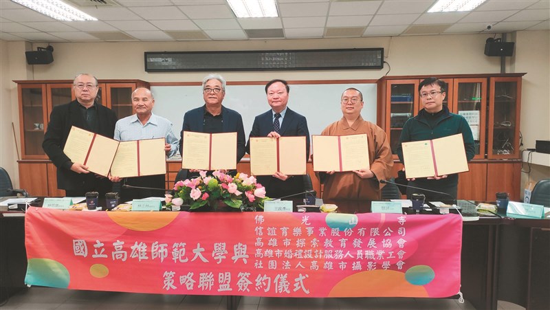 【記者王淑芬高雄報導】高雄師範大學為善盡社會責任及提升校區周邊觀光產業,攜手佛光山等五個團體,昨日於高師大燕巢校區簽署策略聯盟備忘錄,計有高師大校長王政彥、佛光山都監院頭單書記慧屏法師、信誼育樂公司總經理林壬林、高雄市探索教育協會執行長李基源、高雄市婚紗設計工會理事長林明章及高雄市攝影協會理事長陳主文等五個單位代表與會,期能發展共榮、資源共享、創造共贏。