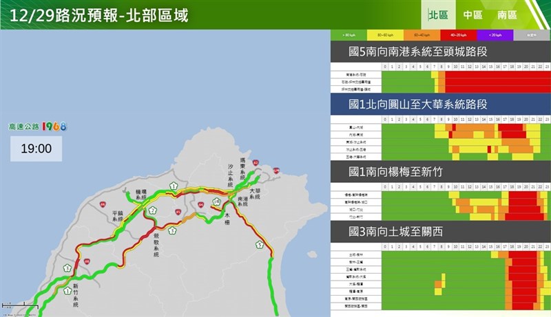高公局指出,根據歷次元旦連假交通特性,透過大數據分析,預測元旦連假前一日及3天連假重點壅塞路段及時段,如國5南向南港系統至頭城路段,元旦連假前一日上午9點起即開始有車多壅塞情形,恐持續至深夜12點。