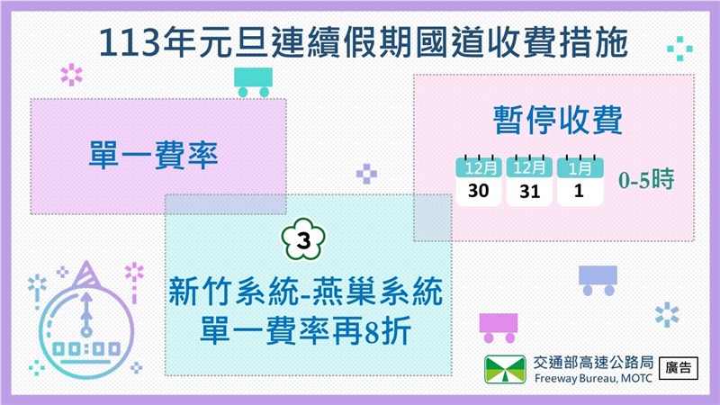 另為分散連假期間尖峰時段車流,元旦連假期間國道實施單一費率、國3「新竹系統至燕巢系統」單一費率再8折收費及每日凌晨0點至清晨5點暫停收費等措施,請民眾多加留意。