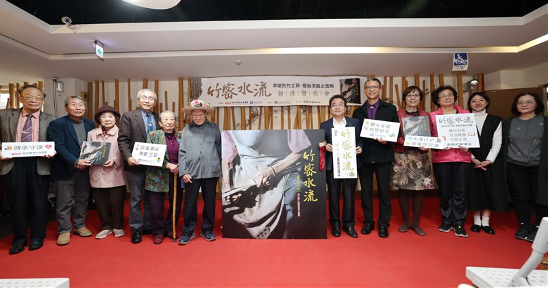 台灣首位以「籃胎漆器」技法創作的工藝家李榮烈(左六),為發揚竹藝內涵,日前發表新書《竹密水流:李榮烈竹工藝-籃胎漆器之濫觴》。圖/南投縣文化局