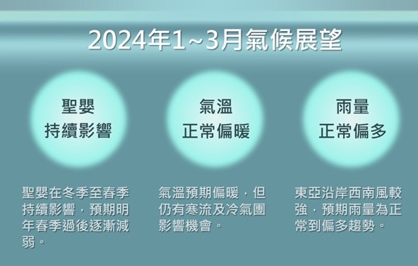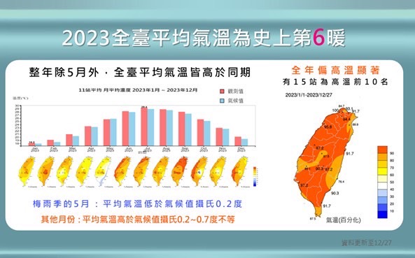 今年全球均溫創新高 明年春季台灣偏暖、雨量偏多 吳亭頤 |2023.12.29 語音朗讀 1111觀看次 字級 大 中 小 交通部中央氣象署表示,今年全球均溫將創下新高,成為1850年有紀錄以來最熱的一年。圖/資料照 【記者吳亭頤台北報導】交通部中央氣象署表示,今年全球均溫將創下新高,成為1850年有紀錄以來最熱的一年,台灣年平均氣溫則為歷史紀錄上的第6名;目前仍持續發展的聖嬰事件,由過去資料分析顯示,多數聖嬰事件發展的隔年,明年1至3月各地平均氣溫以正常至偏暖的機率較大,雨量則為正常至偏多。中央氣象署今日舉辦「年度氣候回顧及未來一季展望氣象預報」記者會;氣象預報中心主任陳怡良指出,回顧過去1年,台灣上半年冷暖交替,下半年則較為偏暖,今年1至11月全球平均氣溫比百年氣候平均值高出1.15度,為自1850年以來第一高溫,暖化趨勢明顯。而台灣平均氣溫也是史上第6暖的一年,平均氣溫24.26度,較百年平均值高出1.14度,同樣也有暖化趨勢,就逐月溫度情況,台灣整年除了梅雨季5月平均氣溫低於氣候值0.2度以外,其他各個月份皆比氣候平均值高出0.2至0.7度。台灣平均氣溫是史上第6暖的一年,平均氣溫24.26度。圖/資料照雨量方面,陳怡良指出,全年降雨量接近氣候平均值9成,但降雨時間分布不均,主要來自於梅雨鋒面及颱風所帶來的降雨,且全台僅東南部雨量多於氣候值;然而,全年降雨日數較氣候平均值少了23.9天,為1951年以來降雨日第2少的年份,此降雨集中的現象符合氣候變遷下的降雨特徵。另外,就西北太平洋颱風生成個數來看,陳怡良提到,今年總共生成17個颱風,比氣候平均值25.4個少,也是1958年以來第2少,但侵台颱風有4個,則接近氣候平均值3.2個。陳怡良表示,目前仍持續發展的聖嬰事件,預測明年春季有逐漸減弱的趨勢;由過去資料分析顯示,多數聖嬰事件發展的隔年,台灣1至3月有氣溫偏暖、雨量偏多的特徵;氣象署檢視該署及各國數值模式的預報,研判明年1至3月各地平均氣溫以正常至偏暖的機率較大,雨量則為正常至偏多。氣象署提醒,每年1、2月是平均氣溫較低的月份,即使冬季整體平均氣溫較氣候平均值為偏暖,但期間仍將有低溫出現,在冷氣團或寒流影響時,須適時做好禦寒措施,使用瓦斯熱水器等則應注意室內通風,避免一氧化碳中毒。此外,冬季部分地區大氣穩定,境外移入或境內產生之污染物不易擴散,易造成細懸浮微粒濃度偏高,空氣品質不佳的情形,敏感族群外出須注意採取防護作為。今年全球均溫將創下新高,成為1850年有紀錄以來最熱的一年,台灣年平均氣溫則為歷史紀錄上的第6名。圖/氣象署提供中央氣象署公布明年第一季氣候展望。圖/氣象署提供 前一篇文章 中油高煉廠土壤整治 估2026年完成 下一篇文章 中職/恰總卸任回二軍執教 平野接掌兄弟兵符 熱門新聞 01銀杏點亮.東京印象2025.12.2302【獻給動物朋友的詩】 最可愛的動物詩路2025.12.2503北捷英雄捨身救人 母盼菩薩接引2025.12.2304【守護家人】 為愛築家2025.12.2305降噪耳機原理2025.12.2206數位科技與信仰交會 推播人間佛教文化2025.12.2207以法相聚 佛光山員義工歲末聯誼2025.12.2408冬季騎遇 大鵬灣蔬旅2025.12.2209全球首創 二氧化碳發電機2025.12.2210社論--悲憐天下父母心2025.12.25 訂閱電子報 台北市 天氣預報 台灣一週天氣預報 相關報導 大肚和美跨橋 力拚明年通車停砍年金案 將釋憲、暫時處分桃機三航廈北廊廳 亮麗啟用台電2026招考 起薪逾4萬元最強戰車上街頭 M1A2T首次戰備偵巡中選會主委 政院提名游盈隆 作者其他文章中斷15年 阿里山林鐵7/6全線通車台鐵加祿站 旅客成長百倍中職統一獅 奪第17座季冠軍莫莫尼:叛逆少年 渴望被聆聽、被理解塞爾蒂克捧第18冠 超越湖人登頂NBA台鐵貨運新車 R200報到
