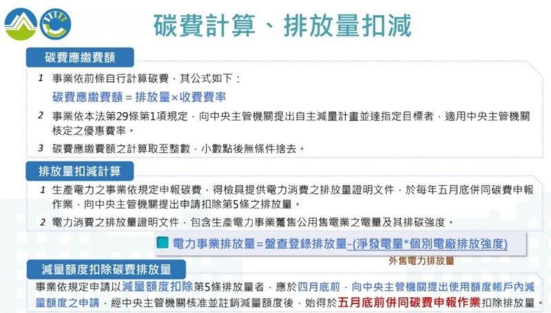 環境部指出,收費對象在計算碳費時,需將前一年度的溫室氣體排放量乘上中央主管機關公告的收費費率,就可算出應繳納的碳費金額,碳費應繳費額之計算取至整數,小數點後無條件捨去;另外,電力業申報碳費可檢具電力消費之排放量證明文件於申報碳費時扣除其排放量。