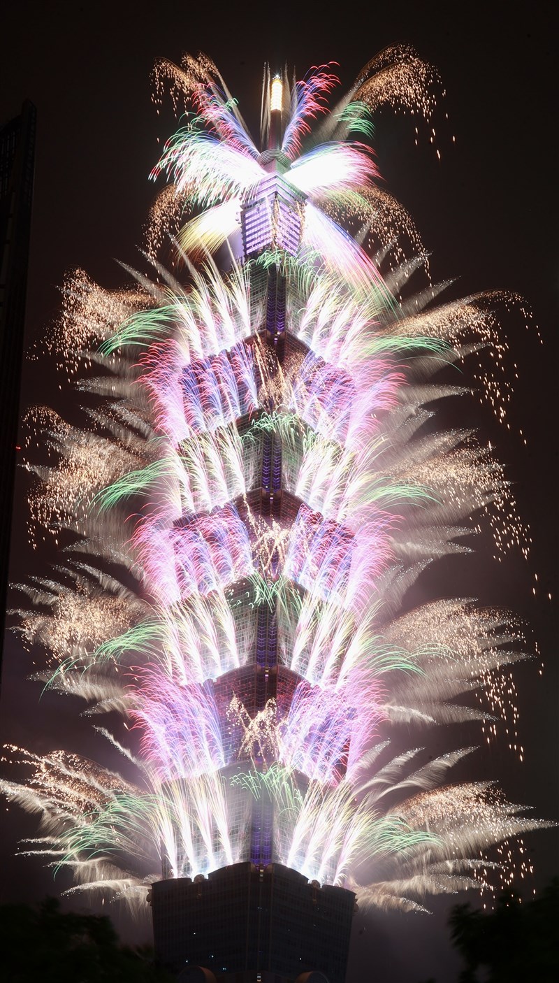 台北101跨年煙火秀今年主題為「彩色世界」,總長300秒、施放1.6萬發煙火,迎接2024年到來。圖/余承翰