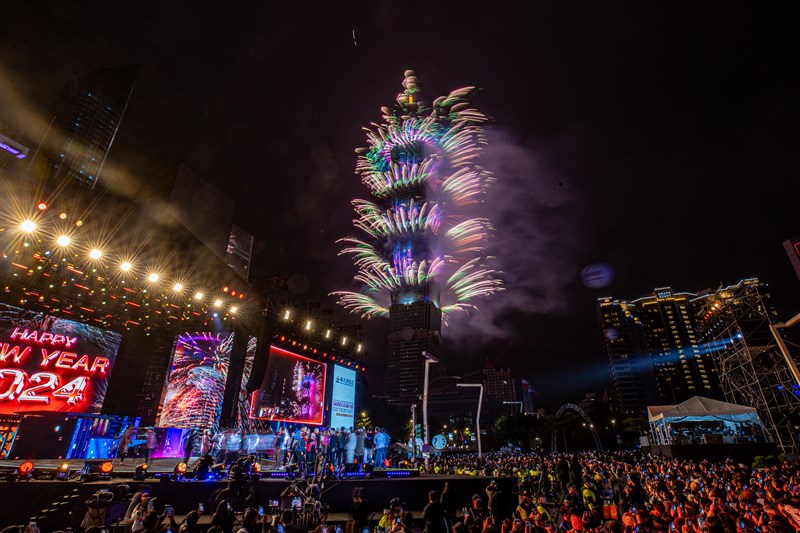 「台北最HIGH新年城2024跨年晚會」12月31日晚間在台北市政府前廣場舉行,當倒數結束瞬間,台北101跨年煙火大秀也隨之登場,各色煙火繽紛綻放,吸引眾人目光。圖/中央社