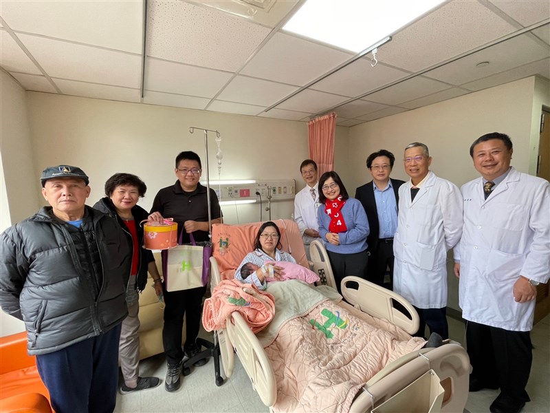 今日清晨6點12分出生的女寶寶,是37歲媽媽(中)的第三胎。北市副市長林奕華(右4)代表市長蔣萬安到婦幼院區,幫元旦寶寶慶生。圖/北市聯醫提供