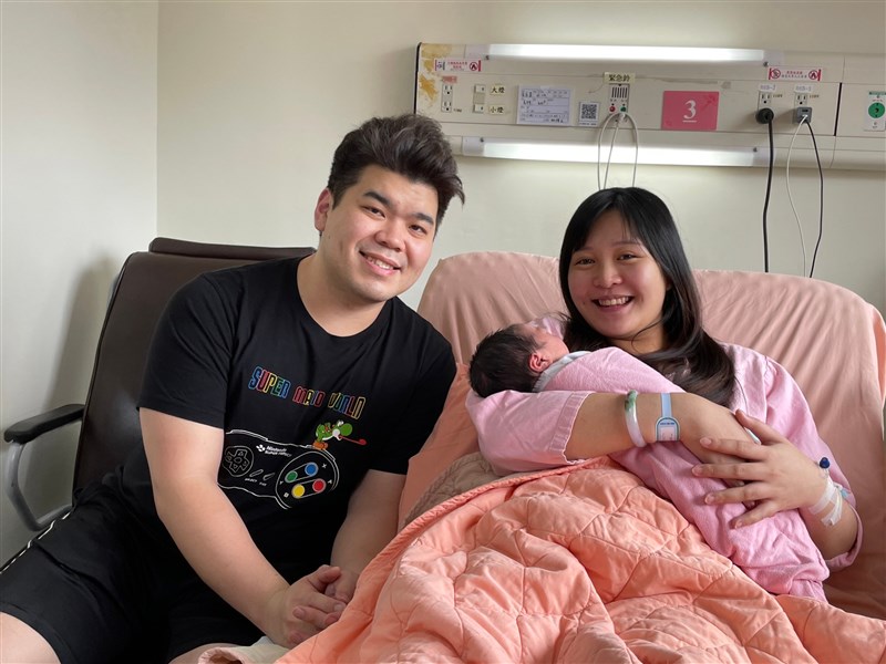台北市立聯合醫院婦幼院區喜迎元旦寶寶,24歲的年輕媽媽,在先生陪伴下,懷抱甫於今日清晨5點5分出生的男寶寶。圖/北市聯醫提供
