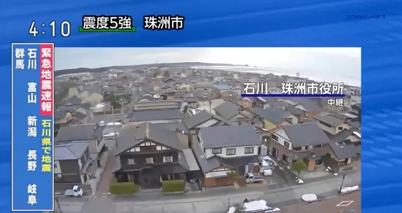 日本石川縣能登地方今天當地時間下午4時許接連發生地震,最大規模7.6。日本放送協會(NHK)架設在珠洲市役所屋頂的攝影機拍下地震發生時劇烈左右搖晃,鏡頭左後方似乎有建築物倒塌,揚起巨大煙塵。圖/截自X平台