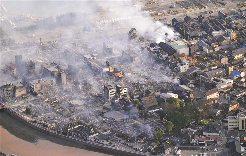 日本石川縣能登半島1日發生規模7.6強震,鄰近震央的該縣輪島市爆發大火,直到2日仍可見到煙霧竄出。圖/美聯社