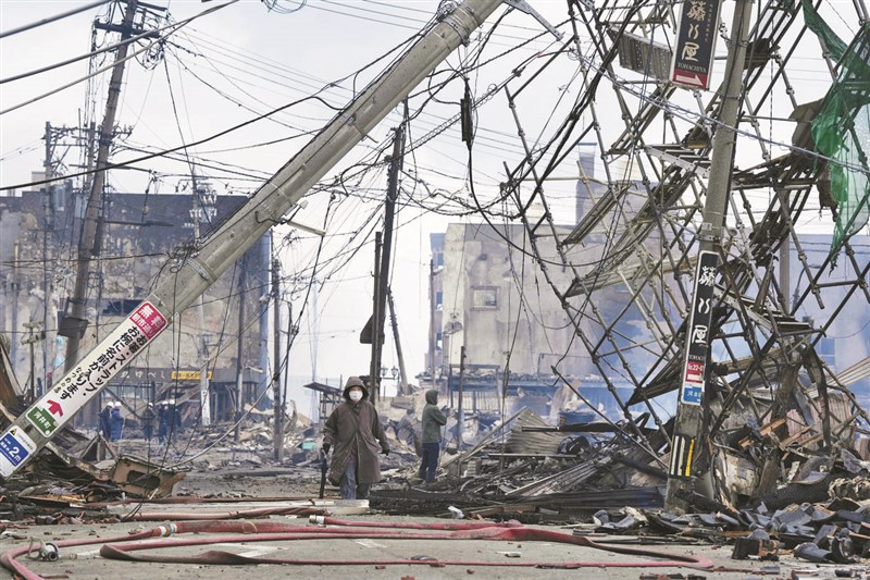 【本報綜合外電報導】日本石川縣「能登」地區,1日下午突然發生規模7.6、最大震度7級強震,不過氣象廳隨後坦承疏失,將地震規模下修至4.6、最大震度3級,目前死亡人數達到48人,全縣還有16人重傷、多人輕傷。石川縣輪島市河井町發生大規模火災,有200多棟建築物完全燒毀, 有著1000多年歷史的輪島早市已化為灰燼,日本皇室取消了新年祝賀活動,美國總統拜登1日發表慰問聲明。石川縣目前開設353處避難所,收容約2萬7785人,其中以輪島市的9229人為最多。日本官房長官林芳正指出,截止2日中午,石川縣與新潟縣等地合計有5萬7360人待在避難所。2日晚上起,能登地區將連2天下雨,北陸地區甚至4日前可能降下「警報性大雨」增加土石流發生機率,恐怕讓災情雪上加霜。