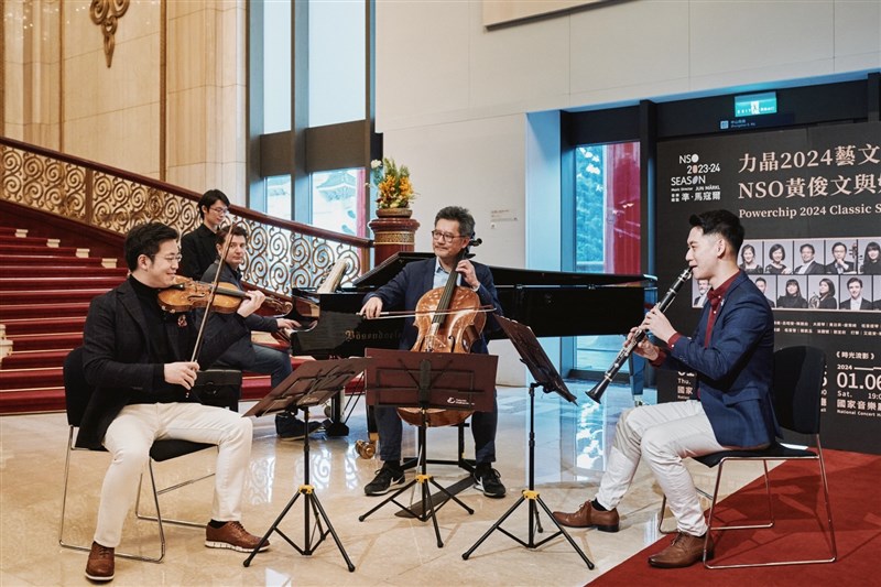 小提琴家黃俊文、大提琴家楊文信、單簧管演奏家賴俊諺、鋼琴家阿萊西奧‧巴克斯在記者會現場,獻演梅湘《時間終止四重奏》片段。圖/國家交響樂團提供