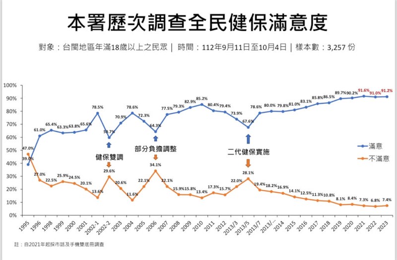 衛生福利部在去年9月11日至10月4日期間,針對台閩地區年滿18歲以上民眾,採採市話及手機雙底冊調查方式,樣本數共3257份,結果顯示滿意度高達91.2%。