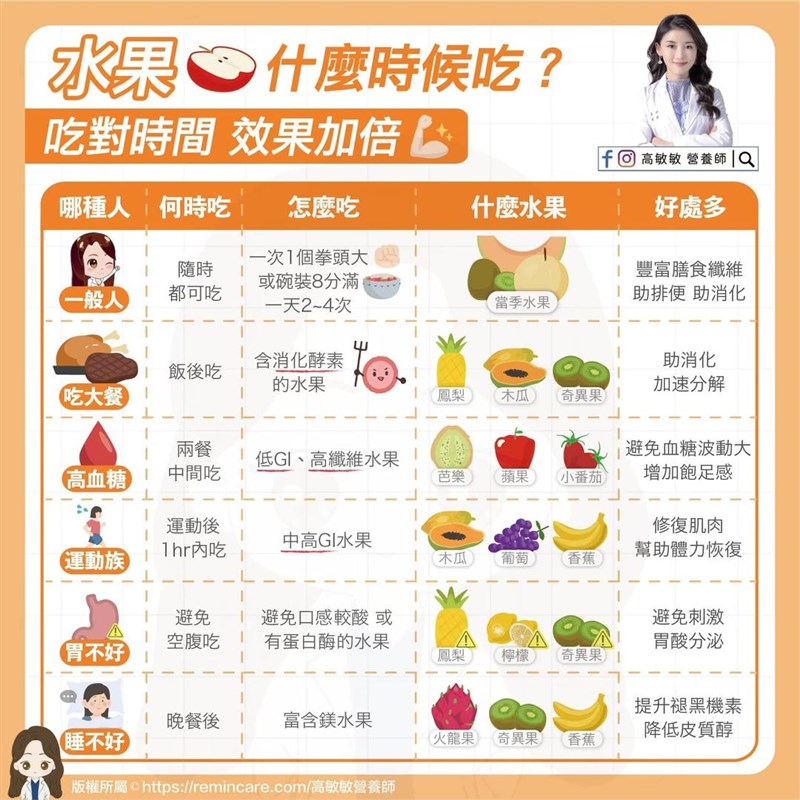 水果何時吃最好?營養師提6種吃法 陳玲芳 |2024.01.07 語音朗讀 6734觀看次 字級 大 中 小 營養師指出,針對不同狀態,「水果」有不同的吃法。圖/pexels 【記者陳玲芳台北報導】吃水果也要看時間嗎?北京中醫藥大學教授、主任醫師李志剛說「是的,就連水都不是什麼時候想喝就喝的,水果也一樣,不是什麼時候想吃就可以肆無忌憚的吃。」國內營養師高敏敏說,其實不同狀態,有不同的吃法。英國人說:「上午吃的水果是金,中午到下午3點是銀,3點到下午6點是銅,下午6點之後的則是鉛。」 吃常溫水果 注意3時間何以這麼說?李志剛表示,因為上午吃水果,不僅可幫助消化,有利於通便,還能用美妙的滋味,帶給自己一天的好心情。但等到晚上6點鐘之後吃水果,尤其是纖維含量很高的水果,會給胃功能不強的人,帶來身體負擔。中醫師提醒,從冰箱拿出來的水果,最好等它們恢復「常溫」再吃。圖/pexels李志剛說,他其實並不贊同這種說法,上午和下午的水果沒什麼差別,營養成分都一樣。對於絕大多數身體健康的人來說,上午吃和下午吃都可以。「需要注意的是三個時間點,飯前、飯後和睡前。 」他建議大家最好在飯前一個小時吃水果,或者飯後兩個小時,睡前一兩個小時不吃。而從冰箱拿出來的水果,最好等它們恢復「常溫」再吃。6種狀態吃法不同營養師高敏敏則認為,不同狀態,有不同的吃法。她列舉出6種狀態及其吃法。圖/高敏敏提供1. 一般健康人「 隨時都可吃」:當季新鮮水果一次一個拳頭大,或碗裝8分滿,一天吃2~4次,足夠的膳食纖維,可幫助排便,水果酵素幫助消化,保持腸胃健康,好處多多。2. 吃大餐時「飯後吃」:吃完大餐後經常會胃脹脹、負擔重,可以吃有消化酵素的水果幫助提高消化力,加速分解澱粉、蛋白質,推薦水果為鳳梨、木瓜、奇異果。圖/pexels3. 高血糖的人「兩餐中間吃」:選擇低GI、高纖維的水果,避免刺激過多胰島素分泌,幫助穩定血糖,也能增加飽足感、不暴飲暴食,推薦水果為芭樂、蘋果、小番茄。4. 運動族「運動後一小時內吃」:中高GI的水果,可幫助體力能量回補,刺激胰島素幫助氨基酸合成蛋白質,達到更好的健身效果。推薦水果為木瓜、葡萄、香蕉。圖/pexels5. 胃不好的人「避免空腹吃」:少吃口感較酸、有蛋白酶的水果,避免刺激胃酸分泌,例如鳳梨、檸檬、奇異果。6. 睡不好的人「晚餐後吃」:可吃富含鎂的水果,以提升褪黑激素分泌、幫助降低皮質醇,達到減輕焦慮、提升睡眠品質的功效,推薦水果為火龍果、奇異果、香蕉。高敏敏說,除了上述六種狀態,也很建議蔬果常常攝取不足的人,可以以水果代替高熱量的下午茶點心或手搖飲料。飯後可吃些有消化酵素的水果幫助消化,只要「適量」,大家都可以安心、開心的吃水果唷!圖/pexels 前一篇文章 ADHD兒童過動症 中藥針灸可改善 下一篇文章 助早療全聯捐百萬 張鈞甯化身甯老闆 熱門新聞 01WTA、ATP年終賽 獎金創新高2025.11.0702再闖WTA年終賽 謝淑薇力拚第2冠2025.11.0703健保補充保費變革 政院急踩煞車2025.11.0704佛光山大學校長論壇 盼教育融入佛法2025.11.0805【詩】再現綠川2025.11.0706補充纖維、鈣、鎂、鉀 預防多種疾病風險2025.11.1107小蠻牛對決辛納 爭年終賽球王2025.11.0708星雲大師全集【傳記】百年佛緣─生活篇 我的衣食住行 5-52025.11.0709美國好手輩出 10人晉級年終賽2025.11.0710【養生百味】冬食淡素 防範疾病2025.11.08 訂閱電子報 台北市 天氣預報 台灣一週天氣預報 相關報導 歲末傳愛關懷弱勢 謝祖武任公益大使罕病病友創作 綻放希望黃豆浸泡過再加熱 去除凝集素不脹氣台灣首款本土咖啡 台農1號亮相BMI太低太高都不好 體脂肪肌肉量是關鍵大稻埕走秀 視障者展現自信 作者其他文章罕病病友創作 綻放希望大稻埕走秀 視障者展現自信更年力綻放 迎向第二黃金人生飲食調理養肺潤燥 立冬防咳、過敏立冬宜養腎固元氣 和緩運動避免熬夜伊甸推頤養食 讓長輩吃得美味
