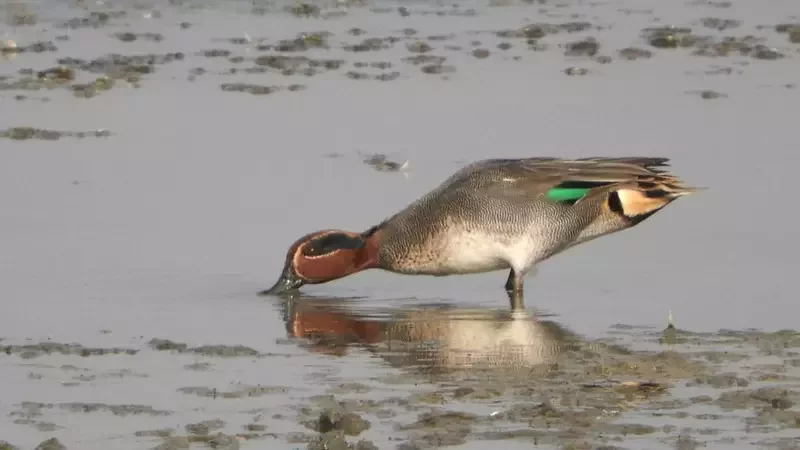 高雄市野鳥學會表示,7日下午終於有鳥友驚喜拍攝到小水鴨等雁鴨,再度回到澄清湖得月樓附近的沉砂區泥灘地停棲、覓食。圖/高雄市野鳥學會提供