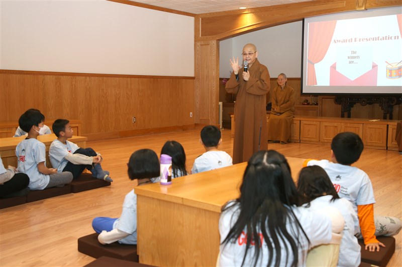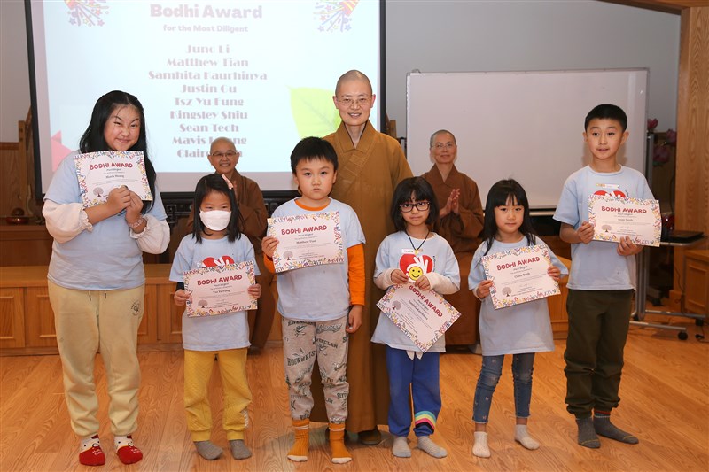 Ven. Zhi Guan presents Bodhi Awards to students who exhibited diligence in their learning. photo/FGS Toronto