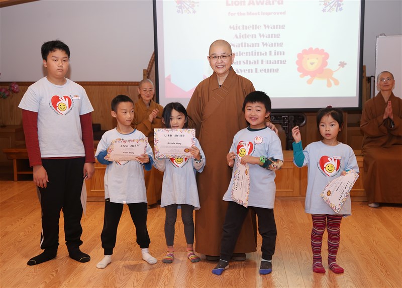 The Abbess of FGS of Toronto, Ven. Chueh Fan presents Lion Awards to students who demonstrated outstanding improvement. photo/FGS Toronto