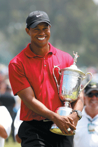 【本報綜合外電報導】歷經五天九十一洞,帶著膝傷痛楚,伍茲度過最艱難考驗,昨天在美國高球公開賽與延長賽打敗老將梅迪亞特,贏得了第三場美國公開賽,第十四座大滿貫賽冠軍。這位「球王」昨天也正好慶祝他在冠軍寶座坐滿五百周,等於他統治高球界接近快十年,伍茲的成就可說是史上運動員之最。