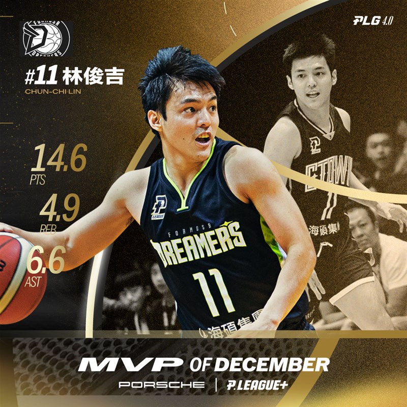 【記者張哲郢綜合報導】P.League今天公布去年12月MVP,帶領福爾摩沙夢想家打出單月7戰全勝戰績的「阿吉」林俊吉,成功以單月14.6分4.9籃板6.6助攻成績,生涯第2度獲獎。
