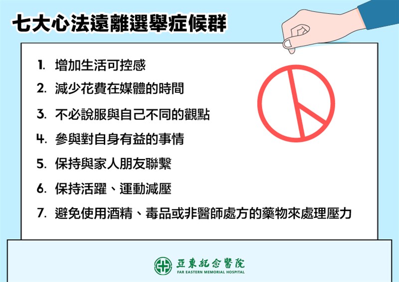 選民掌握7心法 防選舉與心碎症候群 陳玲芳 |2024.01.10 語音朗讀 1668觀看次 字級 大 中 小 醫師表示,「選舉症候群」並非精神科正式的疾病診斷,是指「選舉」這種壓力,對身心狀態的影響。圖/pexels 【記者陳玲芳台北報導】2024年總統大選暨立委選舉如火如荼進行,相關訊息占據了台灣人民一大部分的生活。當選舉落幕時,結果必然是「幾家歡樂幾家愁」,此時,除了候選人外,民眾也容易出現生理和心理的狀況,例如焦慮、易怒、憂鬱等。亞東醫院精神科醫師林竺君提醒民眾,務必注意自己是否出現「選舉症候群」。林竺君醫師指出,臨床上也存在一種「心碎症候群」,主要是由於身體經歷極端的情緒和壓力變化,產生過量的興奮性內分泌激素,導致心臟無法負荷,即壓力影響心血管功能引起的壓力性心肌病變,嚴重者可能面臨生命危險。「政治熱」心生困擾林竺君表示,「選舉症候群」並非精神科正式的疾病診斷,是指「選舉」這種壓力,對身心狀態產生的影響。選舉前,人們擁有各自的政治立場,常處於興奮和激昂的狀態,對選舉結果充滿期待;然而,有部分民眾,在此時就已經出現身心症狀,如焦慮、易怒,甚至「躁症」發作。選舉過程中,有些民眾可能投注大量精力,其壓力反應在生理或心理狀態。除了主動參與的群體外,一般民眾仍會受到選舉周圍「壓力」影響。例如,媒體持續報導民調、弊案等;政論名嘴或候選人以災難化、煽動性言論加劇選情;親朋好友熱烈討論對候選人的看法,使「政治熱」氛圍無所不在。以上情況,皆可能使非候選人的大眾,出現「選舉症候群」。林竺君醫師提供7大心法,包括若遇上選舉相關的談話,不必說服與自己不同的觀點,且練習簡單的話語結束對話。圖/亞東醫院提供林竺君指出,在選舉熱潮中,每個人都可能出現選舉症候群。美國心理學會對2020年美國總統大選的相關研究指出,超過2/3的成年人表示選舉對他們而言,是重要的壓力來源。此外,值得注意的是,曾經或目前接受精神科診斷的患者,也更容易受到影響。另有研究指出,即使被認為對政治較「冷感」的年輕人,同樣可能受選舉影響而出現心理困擾。慎防「心碎症候群」 選前,民眾的憂鬱和焦慮程度逐漸上升,臨床上也經常看到選舉造成身心不適的病人,但通常在選舉結束後,會逐漸緩解。研究顯示,2020年美國總統大選帶來的焦慮和憂鬱,甚至超越2019年新冠疫情。常見選舉症候群症狀包含焦慮、憂鬱、低落、注意力不集中、易怒、異常亢奮、疲倦、失眠、食欲變化、絕望感或不明原因身體不適。林竺君提醒,臨床上存在一種「心碎症候群」,嚴重者可能面臨生命危險。她提示「7大心法」遠離選舉與心碎症候群:1. 增加生活可控感,專注於自己可以控制的事情。維持規律的生活和工作,選舉日到來前,不要過度、反覆猜想可能的不良結果。2. 減少花費在媒體的時間,不過度攝取相關訊息。3. 若遇上選舉相關的談話,不必說服與自己不同的觀點,且練習簡單的話語結束對話。4. 參與對自身有益的事情,如紓壓活動,或將壓力轉化為有意義的活動,例如擬定投票計畫。5. 保持與家人朋友聯繫。6. 保持活躍,透過運動減壓。7. 避免使用酒精、毒品或非醫師處方的藥物來處理壓力。若以上方式,仍無法減緩身心不適,林竺君建議,應尋求專業醫療協助。若以上方式仍無法減緩不適,林竺君醫師建議,應尋求專業醫療協助。圖/亞東醫院提供 前一篇文章 【簡訊】 下一篇文章 五旬婦腹痛不止 竟是「這器物」穿透子宮 熱門新聞 01台中新社花海 重現經典卡通2025.11.0602WTA、ATP年終賽 獎金創新高2025.11.0703大崗山淨山健走行三好 佛光人守護山林2025.11.0504法水寺送給天國的信 700天燈傳達想念祝福2025.11.0505佛光山中區三皈五戒 佛子安頓身心2025.11.0506山本由伸 拚美職首座賽揚獎2025.11.0507星雲大師全集【傳記】百年佛緣─生活篇 我的衣食住行 5 - 32025.11.0508【古堡麗影】倫敦塔:英國千年歷史活教材2025.11.0509古老金幣2025.11.0510【快樂塗鴉簿】夢境旅遊2025.11.05 訂閱電子報 台北市 天氣預報 台灣一週天氣預報 相關報導 飲食調理養肺潤燥 立冬防咳、過敏攝取益生菌腸保健康 泡菜味噌納豆好菌多中藥本草文化節 11月8日故宮南院登場立冬宜養腎固元氣 和緩運動避免熬夜學童當小農 種出玉米窗簾食物燒焦、蔬菜久煮 烹調不當破壞營養素 作者其他文章更年力綻放 迎向第二黃金人生飲食調理養肺潤燥 立冬防咳、過敏立冬宜養腎固元氣 和緩運動避免熬夜伊甸推頤養食 讓長輩吃得美味握力減弱健康警訊 反映身體功能下降AI判讀、基因、血液檢測 3技術早期揪出失智症