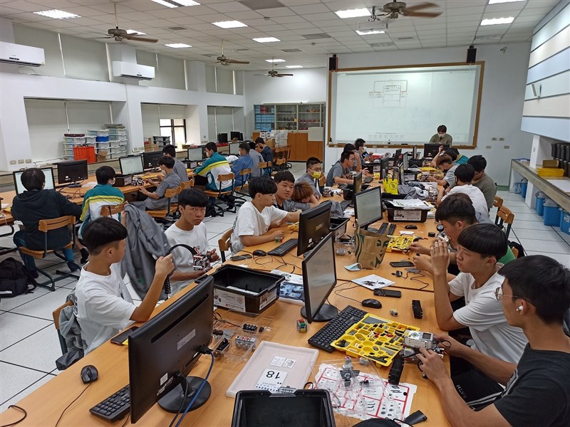 機械人組裝操作實作實習課程-授課講師指導學生組裝機器人及編寫程式。圖/教育部提供