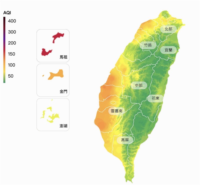 宜蘭、花東空品區為「良好」等級;北部、竹苗部空品區及澎湖地區為「普通」等級,北部局部地區及澎湖地區短時間達橘色提醒等級;中部、雲嘉南、高屏空品區為「橘色提醒」等級;馬祖及金門為「紅色警示」等級。