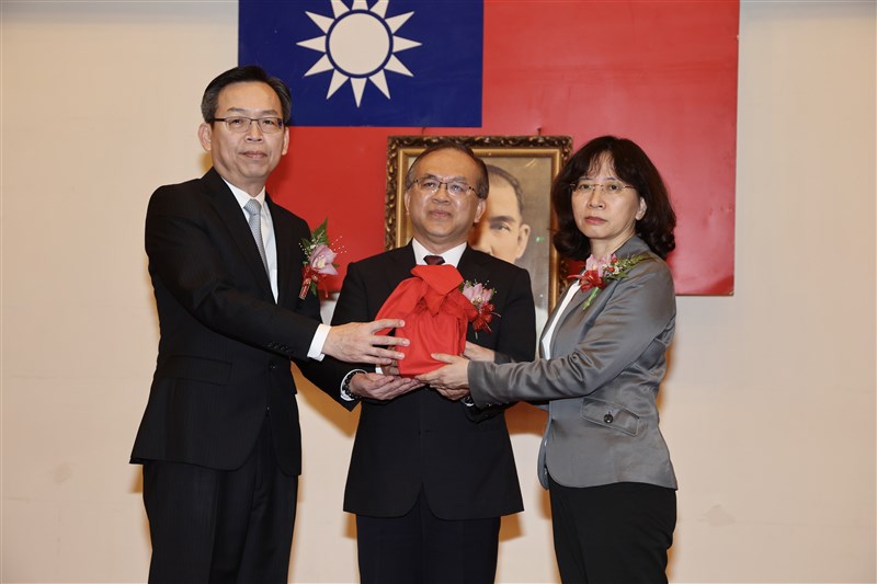 民航局新舊任局長何淑萍(右)、林國顯(左)今天在交通部政務次長陳彥伯(中)監交下完成交接。圖/民航局提供