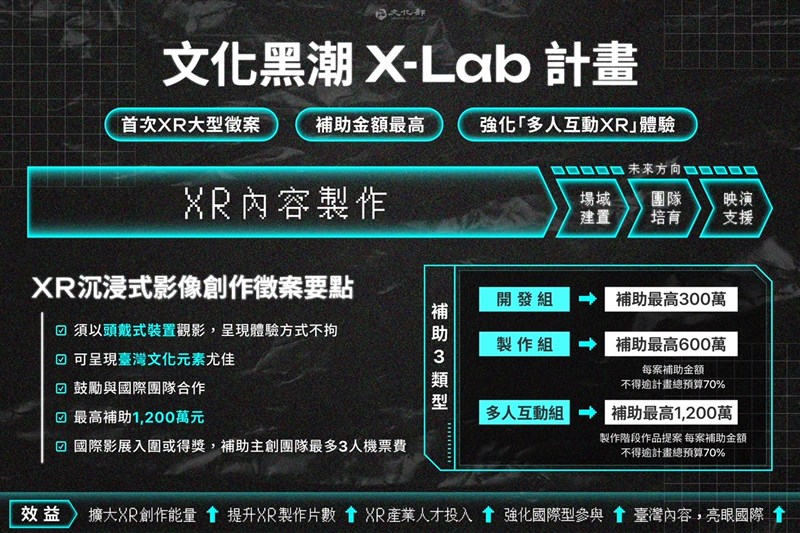 「文化黑潮之XR沉浸式影像創作補助」,自1月22日起至3月1日收件。圖/文化部提供