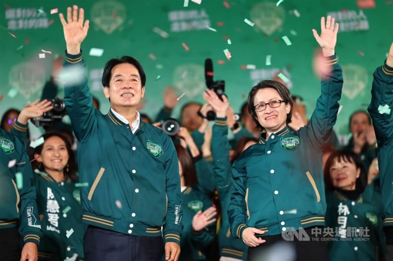 民進黨正副總統候選人賴清德(前左)、蕭美琴(前右)13日晚間宣布贏得2024總統大選,兩人揮手回應現場支持者熱情歡呼。圖/中央社