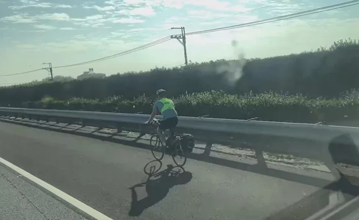 【本報彰化訊】在重機騎士爭取國道路權時,一名自行車愛好者不知為何竟騎上國道路肩,一旁開車民眾相當傻眼,拍下不可思議一幕。