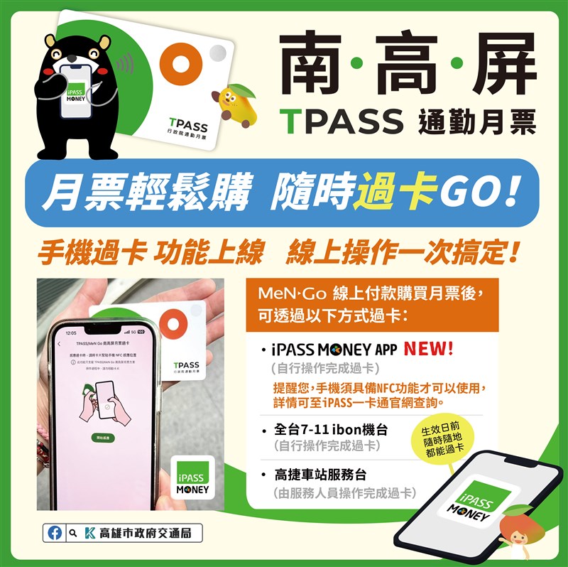 南高屏TPASS啟用更方便 增線上過卡功能 |2024.01.20 語音朗讀 328觀看次 字級 大 中 小 南高屏TPASS公共運輸通勤實體卡月票,結合一卡通公司iPASS MONEY App推出線上服務「TPASS/MeNGo 南高屏月票過卡」新功能。圖/資料照片 【本報高雄訊】南高屏TPASS公共運輸通勤實體卡月票,結合一卡通公司iPASS MONEY App推出線上服務「TPASS/MeNGo 南高屏月票過卡」新功能,讓購買會員線上完成過卡就能啟用。以MeNGo平台發行的南高屏TPASS公共運輸通勤月票,自去年4月底推出後,每月使用人數成長6倍。高雄市政府交通局持續精進服務流程,針對使用實體卡月票會員,推出線上服務新功能。交通局新聞稿指出,目前使用TPASS實體卡月票會員,在MeNGo官網/App線上購買月票方案後,須在啟用日前持卡片到高捷車站服務台、7-ELEVEN ibon過卡後才能使用。這次和一卡通公司合作,在iPASS MONEY App上新增「TPASS/MeNGo 南高屏月票過卡」功能,民眾在MeNGo官網/App購買月票方案後,可直接開啟手機iPASS MONEY App過卡,免出門就能一次搞定。圖/高雄市政府交通局提供高市交通局長張淑娟表示,運用MeNGo平台發行的南高屏TPASS公共運輸通勤月票,是全台唯一採記名制月票,具有專屬個人化服務。可透過手機查詢搭乘公共運輸紀錄、每名會員減碳量計算及卡片交易紀錄等資料,為提升民眾使用便利性,增加過卡功能。此外,為鼓勵民眾體驗新功能,即日起至7月31日,透過iPASS MONEY App完成過卡會員,每次可獲得新台幣10元回饋金(將於次月15日前轉入iPASS MONEY電支帳戶,會員需於過卡當月底前完成註冊iPASS MONEY電支帳戶)。圖/高雄市政府交通局提供 前一篇文章 保育鳥類羽毛勿撿拾 觸法判刑還要罰錢 下一篇文章 22日太平山有機會下雪 這3處是熱門地點 熱門新聞 01【分數之外】看見另一種英文2026.04.0802清明豪雨 合歡溪出現新堰塞湖2026.04.0903杉林溪園區 紫藤花盛開2026.04.0804計程車掛牌費喊到35萬元 交部出手2026.04.0805火金姑故鄉 賞螢好去處2026.04.0906哥國動盪城 變身世界圖書之都2026.04.0807【練瑜伽品生活】英雄式二 英雄不能只看正面2026.04.0808吃素也能大補「鐵」 開心果芝麻含量豐2026.04.0809市井日常入畫 陳臻描繪庶民百態2026.04.0910治腰痛 步行、慢跑讓椎間盤好好呼吸2026.04.09 訂閱電子報 台北市 天氣預報 台灣一週天氣預報 相關報導 五泰輕軌路線近溼地 環團憂生態熱氣球嘉年華 7月台東登場黑鳶獲救 癒後野放萌寵商機退燒 動物農場吹熄燈號大鵬灣帆船生活節 開幕人口持續減少 今年新生兒恐跌破9萬