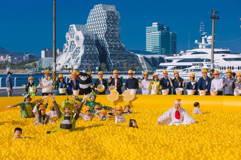 陳其邁與港務公司董事長李賢義攜手宣布「市港合作」,現場布置如遊樂園般的黃色球池,與小朋友一起開啟儀式,希望帶給市民及遊客加倍的療癒感與幸福感。