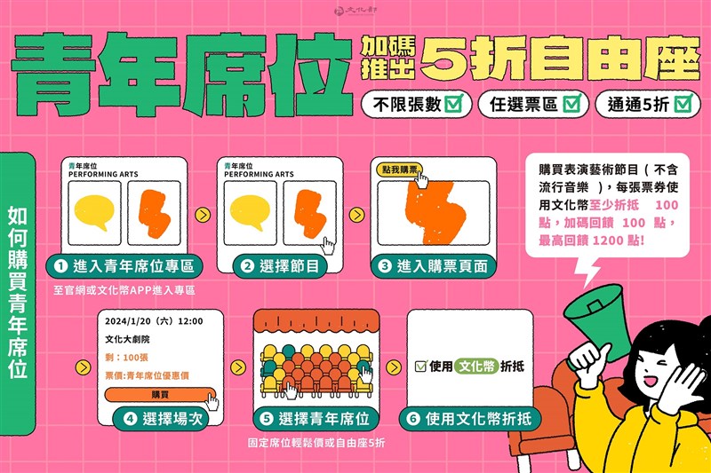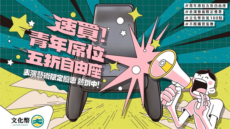 表演藝術類的文化幣優惠方案,除原有的限量指定席位享5折或5折以下的輕鬆價,今(22)日文化部宣布加碼推出「5折自由座」,讓青年朋友自由選位,以5折票價入手自己喜歡的位置。圖/文化部提供