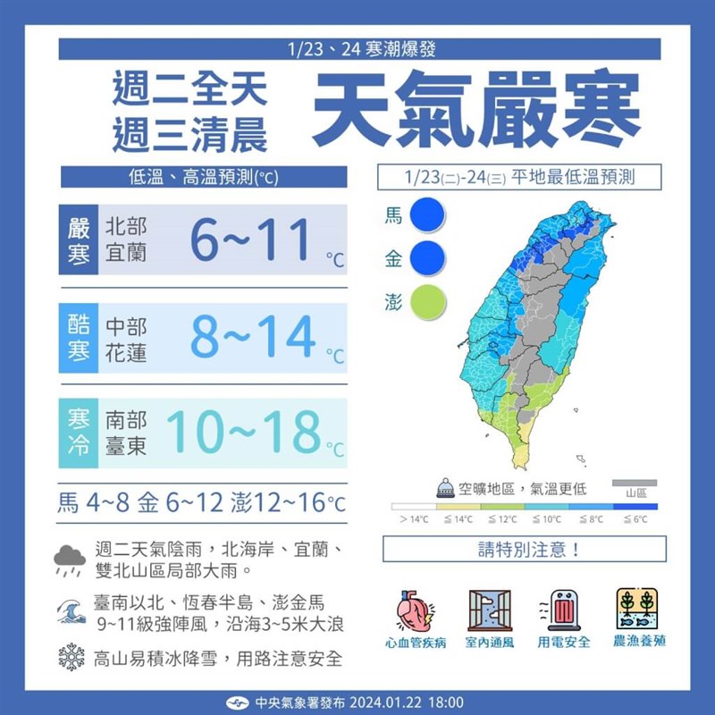 氣象署表示,今晚到明晨,寒流持續影響,各地天氣常寒冷,高雄以北、宜蘭及花蓮地區有10度以下低溫發生的機率,北部近山區及空曠地區甚至只有6度左右,其他地區低溫約12、13度。圖/取自facebook.com/cwa.weather