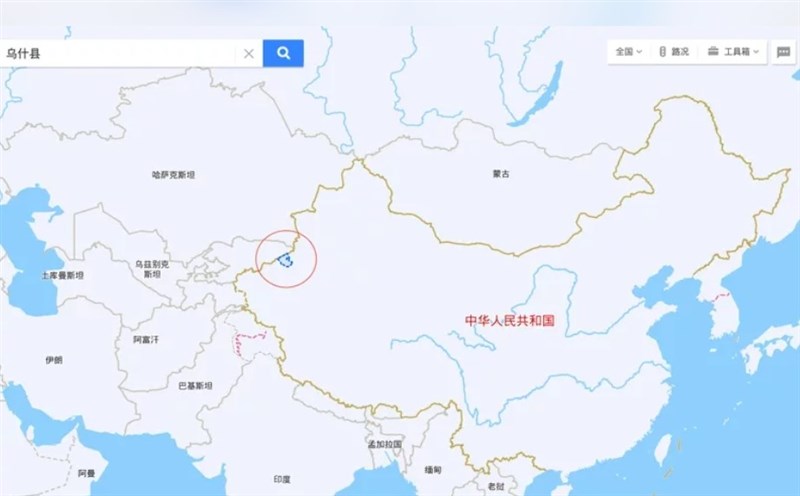 傳出7.1級地震的新疆阿克蘇地區烏什縣(圖紅色圓框處)鄰近中亞國家吉爾吉斯。圖/截自百度地圖