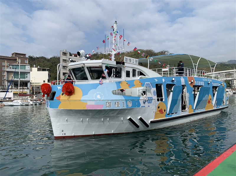 電力驅動渡輪「雄棧1號」於高雄鼓山魚市場後船室外舉行啟用式,這艘重49噸、長20公尺,可承載85名乘客、23輛二輪機車,舒適無雜音及油味的渡輪將提升乘客的舒適度及優化服務品質。