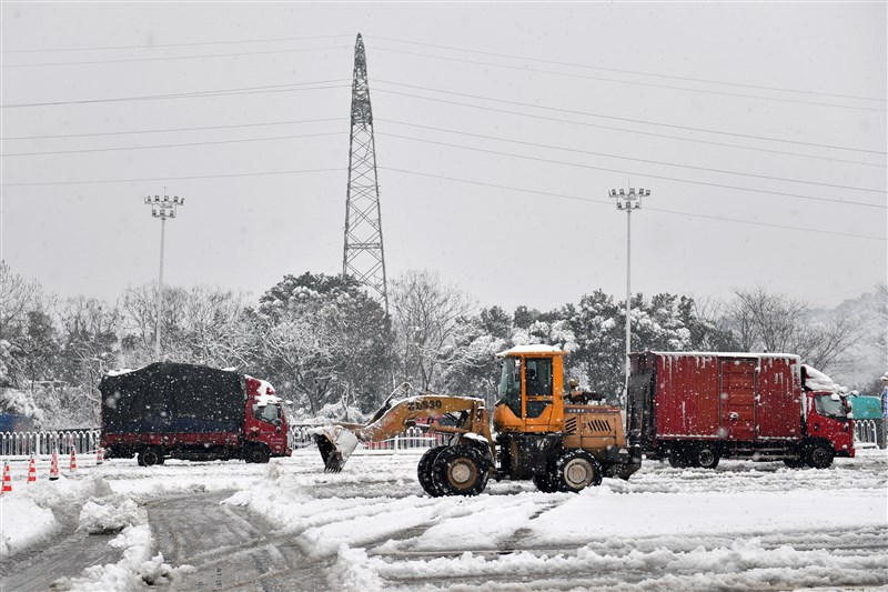 1月22日,在湖南省長沙市,鏟車在長張高速長沙西收費站清理積雪。圖/新華社