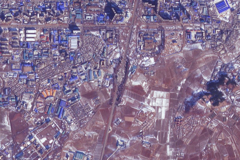 23日的衛星影像清楚可見,位於北韓平壤的統一門已消失。圖/美聯社