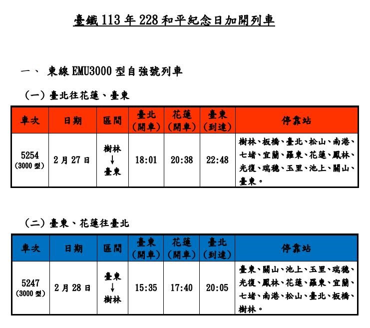 8列次加開! 台鐵27日至28日假期營運調整公佈 |2024.01.25 語音朗讀 328觀看次 字級 大 中 小 因應228和平紀念日,台鐵公司宣布,27日至28日全線加開各級列車,總計8列次。圖/資料照 【本報台北訊】因應228和平紀念日,台鐵公司宣布,27日至28日全線加開各級列車,總計8列次,其中包含東部幹線樹林=台東EMU3000型自強號列車2列次、西部幹線南港=彰化普悠瑪自強號直達車2列次、七堵=高雄EMU3000型自強號列車2列次及七堵=潮州EMU3000型自強號列車2列次。台鐵公司提醒,因非連續假日,請旅客依一般訂票期程訂票。圖/台鐵公司提供圖/台鐵公司提供 前一篇文章 雲水自在、祥和歡喜 佛光山2/10啟動平安燈法會 下一篇文章 連7年總預算有賸餘 政院:妥善運用 全民共享經濟成果 熱門新聞 01法全票通過 掠奪文物歸還中國2026.04.1702MLB太空人打敗洛磯 鄧愷威中繼成功2026.04.1603勞動部將研議 勞退舊制移入新制2026.04.1804【詩】靜寂 2026.04.170545%失智症可預防 類黃酮食物護大腦2026.04.1606多倫多佛光山寺院體驗營 青年探索內心2026.04.1607【詩】春天的孤挺花2026.04.1608【詩】 鐮刀俠2026.04.2109星雲大師紀念特展 紐西蘭一館開幕 2026.04.1610普門品交響清唱劇妙法之歌 5月12日中山堂首演2026.04.17 訂閱電子報 台北市 天氣預報 台灣一週天氣預報 相關報導 花蓮疊石藝術季 高手雲集寵物美容定型契約 飼主怨被超收費桃園燈會作品 開啟新篇章體驗超輕航機 5月報名都市林10年計畫 打造樹蔭通勤廊道還地於河 磺港溪重生