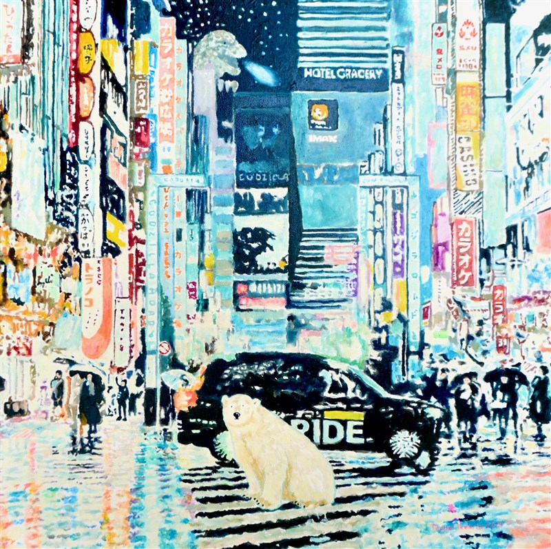 【記者曹麗蕙台北報導】日本大城市中燈紅酒綠的街道,一隻北極熊坐在斑馬線上,眼神充滿孩子般的好奇與天真,與背景五光十色的光影形成強烈對比。這是日本藝術家池平徹兵的作品〈現代借景—新宿〉。他延伸日本園林美學「借景」中「珍惜每個微小的美景」的理念,將看似不存在同一空間或平面的景色繪製下來,拼接成一幅幅如夢似幻般動人的美景。