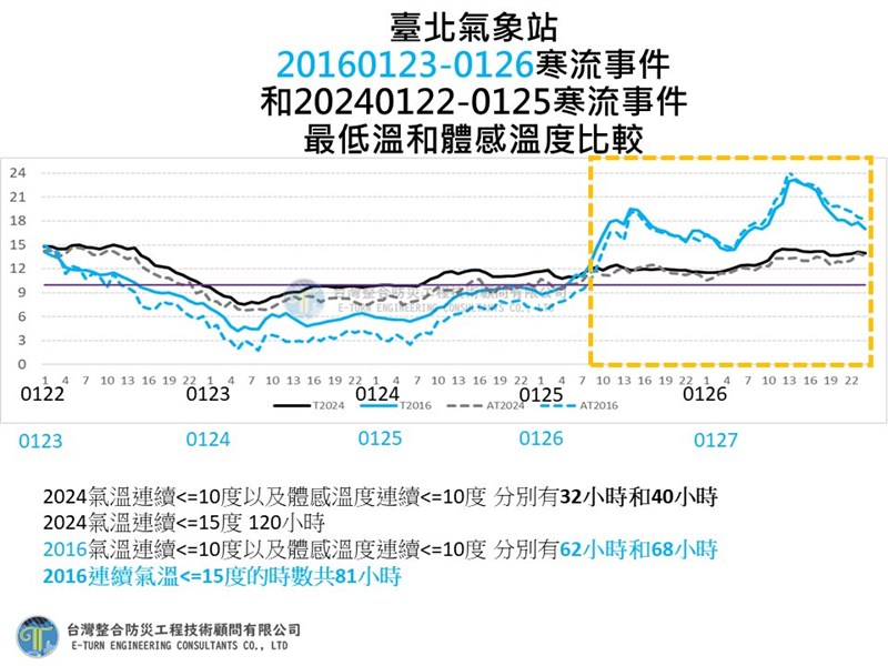 賈新興發布20240123寒流事件和20160124寒流事件比較資料。他表示,以台北氣象站為例,第一是2016年極端低溫勝出,第二是2024年低溫持續時間長、2016年回溫快。