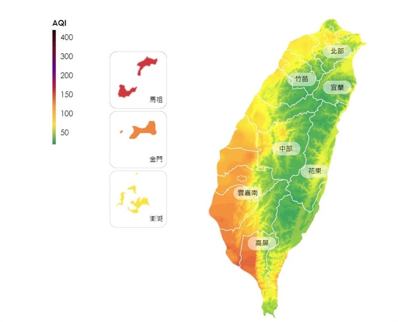 根據10時的監測結果顯示,包含雲嘉南、高屏區及馬祖、金門空氣品質已經達到「橘色提醒」等級。