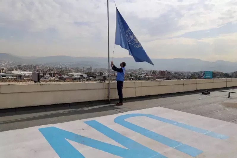 以色列指控聯合國近東巴勒斯坦難民救濟工作署部分員工,參與去年10月哈瑪斯越境突襲,美國等國陸續宣布暫停提供該機構額外資金。圖為聯合國近東巴勒斯坦難民救濟工作署一名員工去年11月在黎巴嫩首都貝魯特的區域辦事處將聯合國旗幟降下。 圖/法新社