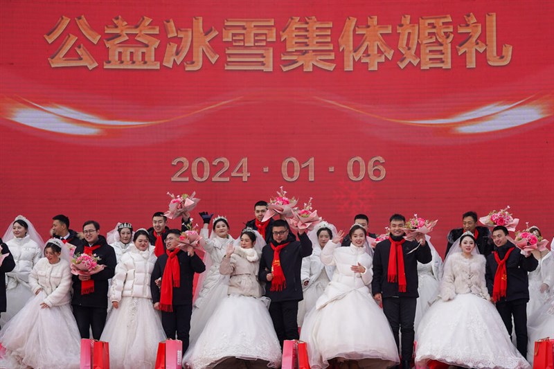 陸媒27日報導,為疏解農村男青年的婚戀難題,中國多地陸續祭出「紅娘獎」,只要撮合結婚就給予最高人民幣1000元(約新台幣4400元)的介紹費。圖為1月6日,35對新人在哈爾濱冰雪大世界舉辦集體婚禮。圖/中新社