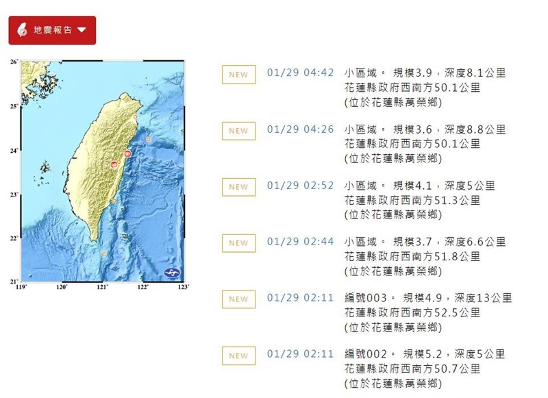 台灣在1分鐘內發生兩起有感地震,分別為在凌晨2點11分22秒,規模5.2,地震深度5公里;2點11分55秒,接連發生規模4.9地震,地震深度13公里。
