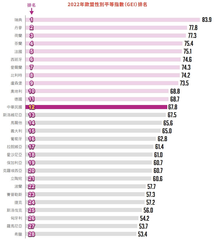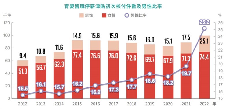 政院公布性別圖像 25.2%男性育嬰留停創新高 |2024.01.29 語音朗讀 300觀看次 字級 大 中 小 政府在2021年將育嬰留職停薪津貼,從6成提升到8成後,2022年男性申請比例達25.2%,較2020年的18.2%提升7個百分點,創下歷年新高。圖/Unsplash 【本報台北訊】行政院今(29)日發布「2024年性別圖像」顯示,政府在2021年將育嬰留職停薪津貼,從6成提升到8成後,2022年男性申請比例達25.2%,較2020年的18.2%提升7個百分點,更創下歷年新高。行政院性別平等處透過新聞稿指出,「2024年性別圖像」首度納入2023年經濟合作暨發展組織(OECD)社會習俗性別指數(SIGI)評比,台灣的成績榮獲全球第6名,亞洲第1名;行政院在2023年建立「我國性別平等指數」,與歐盟27個國家「性別平等指數」(GEI)相較,台灣成績排名第12名。行政院說,政府推動性別友善職場,鼓勵男性共同分擔家務,2021年7月起育嬰留職停薪津貼,從6成提升到8成、放寬彈性申請等,使2022年男性申請比例達25.2%,較新制實施前2020年的18.2%,提升7個百分點,創下歷年新高。圖/行政院性別平等會網頁在女性參與決策部分,2024年1月第11屆立法委員選舉當選人,女性占41.6%,與2020年選舉結果相同,但較2022年1月第10屆立委補選後,女性占42.5%略為下降;2022年九合一選舉後,各地方政府一級主管有7縣市的女性比例達1/3以上,另有4個縣市不到20%。在人身安全部分,依性騷擾防治法受理性騷擾申訴調查結果成立事件,被害人超過9成是女性;在「虛擬環境-科技設備」場所發生的數位及網路性別暴力,占所有場所約2成4。行政院性平處表示,近年積極培育女性科研人才, 2021年女性研究人員占23.1%,呈穩定成長趨勢。高等教育階段,2020年女性畢業生就讀STEM(科學、技術、工程、數學)領域,以「自然科學、數學及統計」43.1%最多、「資訊通訊科技」29.5%次之、「工程、製造及營建」18.9%再次之。行政院性平處說,與主要國家相比,台灣高等教育女性投入「資訊通訊科技」領域占比,較其他國家高出3.9到8.1個百分點。圖/行政院性別平等會網頁 前一篇文章 NBA/杜倫轟「雙二十」活塞爆冷打贏西區龍頭 下一篇文章 投資股市信心指數衝4年新高 帶動民眾消費意願 熱門新聞 01點亮慈悲光明 雲林講堂觀音燈會啟燈2026.02.1202【閃文集】我愛鬱金香2026.02.1003佛光山印尼佛教學院 跨校簽MOU2026.02.1004《化為千手》醫者路 黃致錕為病友證婚2026.02.1405【斗室有燈】返鄉過年的道途上2026.02.1306陸多地開兩會 機器人記者忙跑新聞2026.02.1007高雄果嶺公園 大眼睛添童趣2026.02.1308思惟霍諾德攀登台北1012026.02.1109強烈風暴連襲葡萄牙 佛光會馳援2026.02.1110紐西蘭北島佛光山 歲末圍爐迎新春2026.02.12 訂閱電子報 台北市 天氣預報 台灣一週天氣預報 相關報導 蘭嶼巡防艦交船台美貿協敲定 學者:短空長多 4年42.5億元 助中小微企業升級賴率三軍司令 催速審國防預算涉貪汙 高金素梅住辦遭搜索新春換新鈔 全台455據點可兌換