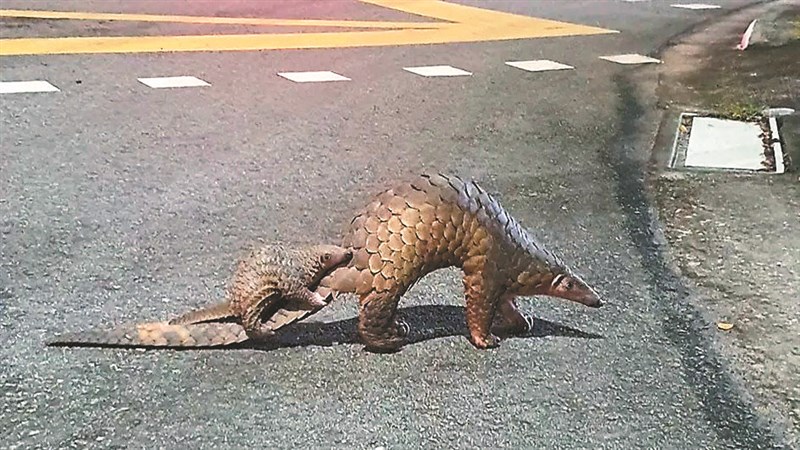 根據畫面顯示,一隻成年穿山甲橫越馬路,尾巴上赫然坐著身形小了約三分之一的另一隻小小穿山甲,似乎是「媽媽」帶著「小孩」過馬路,畫面中沒有車輛行駛經過。傅姓網友則寫著:「希望牠們路上平安。」