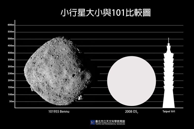將於周五掠過地球的2008 OS 7 小行星直徑接近台北101大樓。左為同是阿波羅族的貝努小行星,直徑約500公尺。圖/台北天文館提供